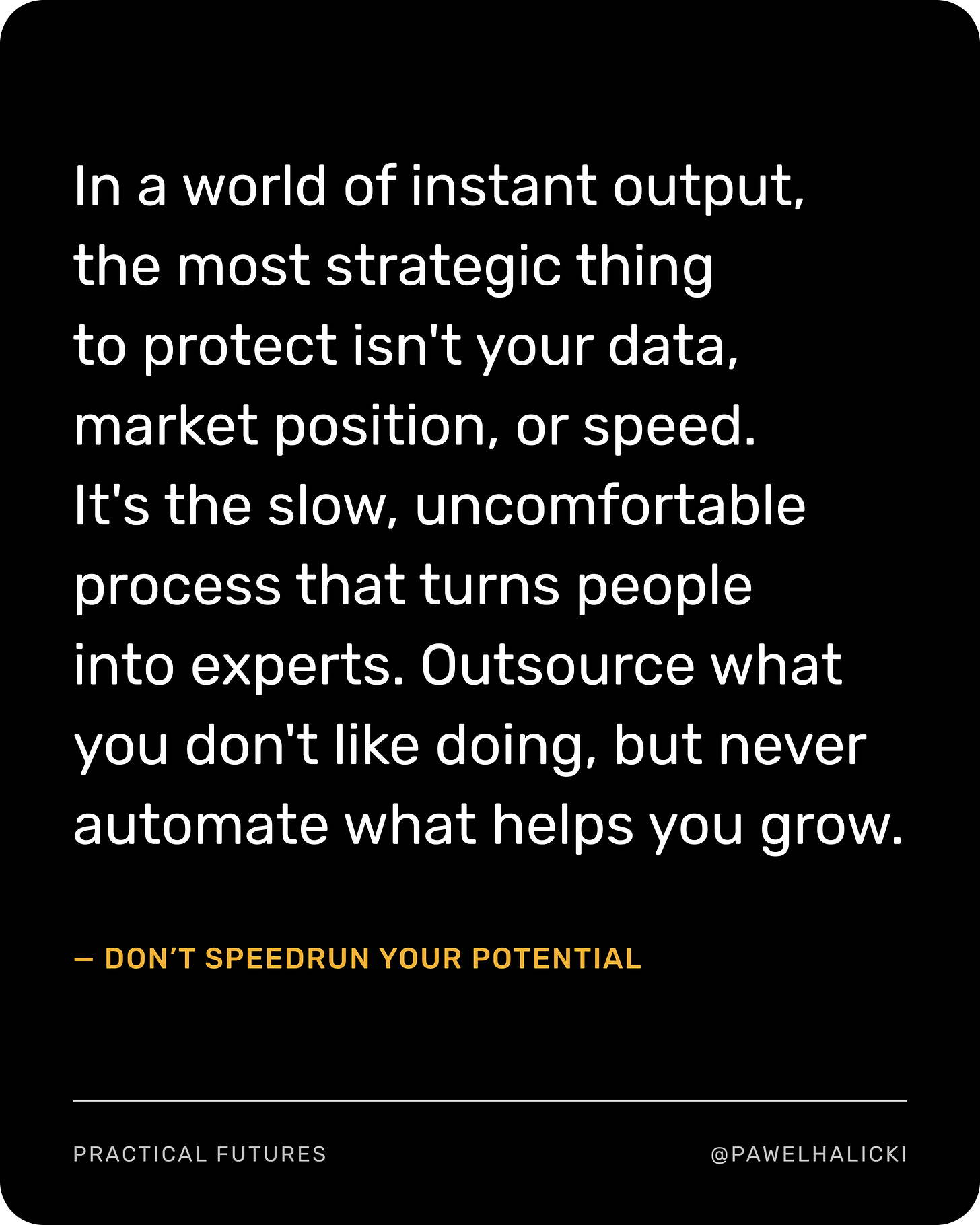 - Don’t speedrun your potential. Automate what you don’t want to do, but never let the machines do what you love. Skip the cutscenes, but don’t skip the part where you get good. Okay, everyone, we’re almost there.