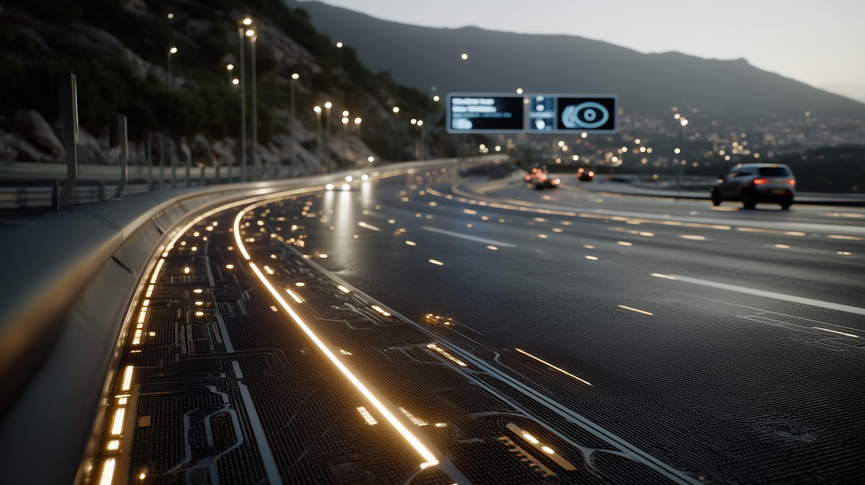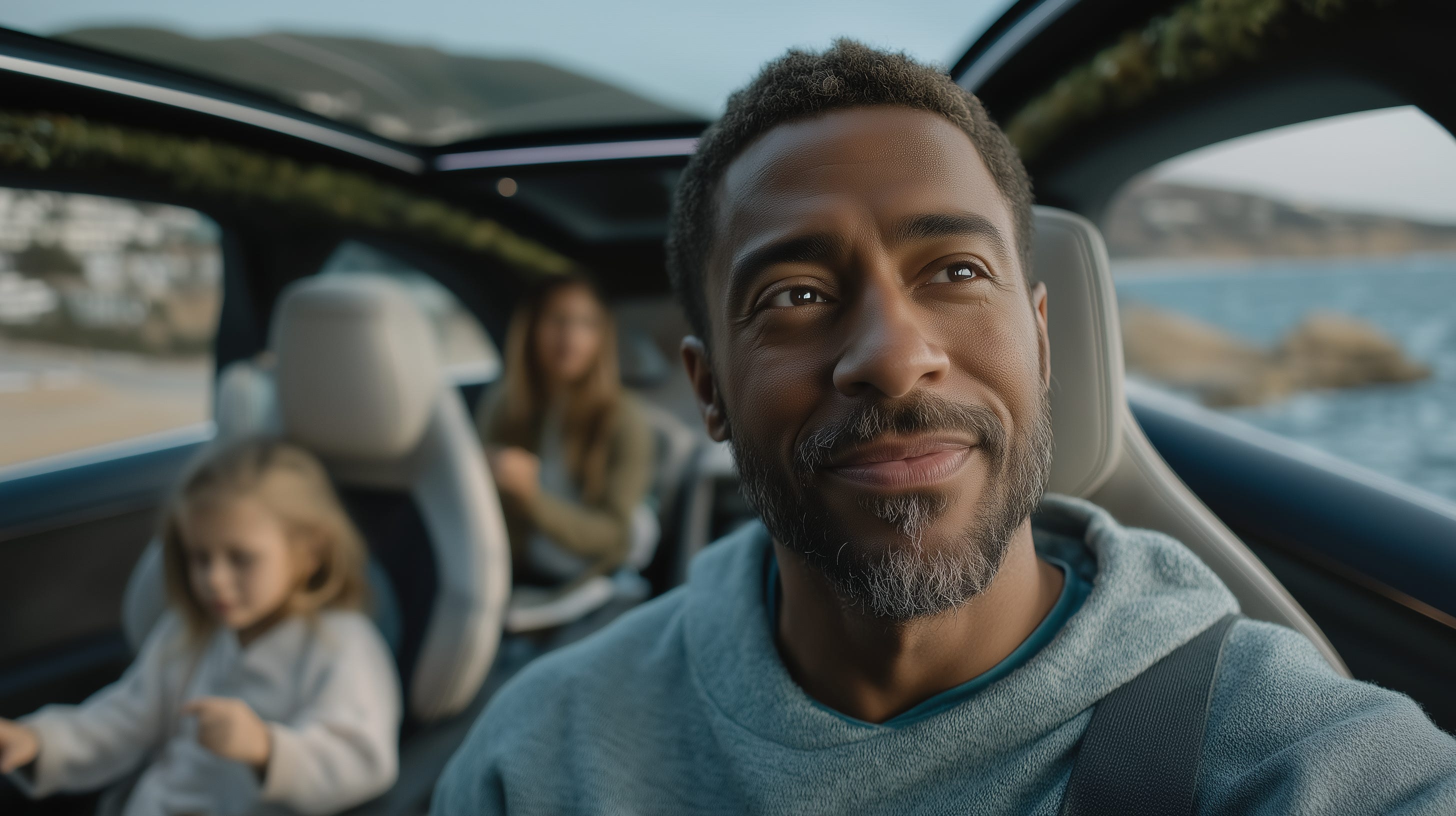 The driver’s seat gives him a soft buzz. Ready for the scenic part, he blinks awake and shakes off the nap. Their transport glides in lane, locking speed to the flow.