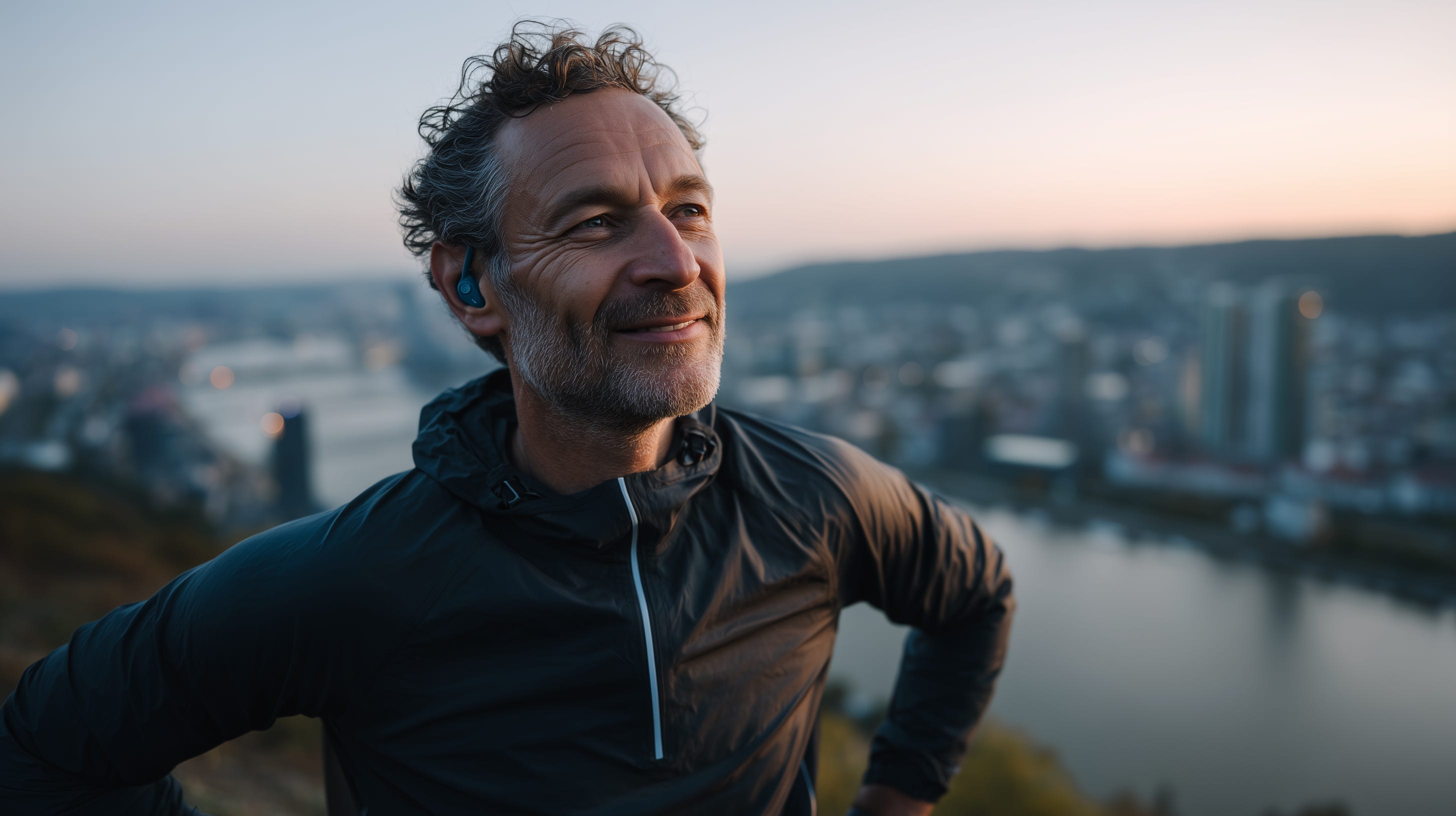Picking up the pace, he continues to nod at the workspace voice in his ears.
