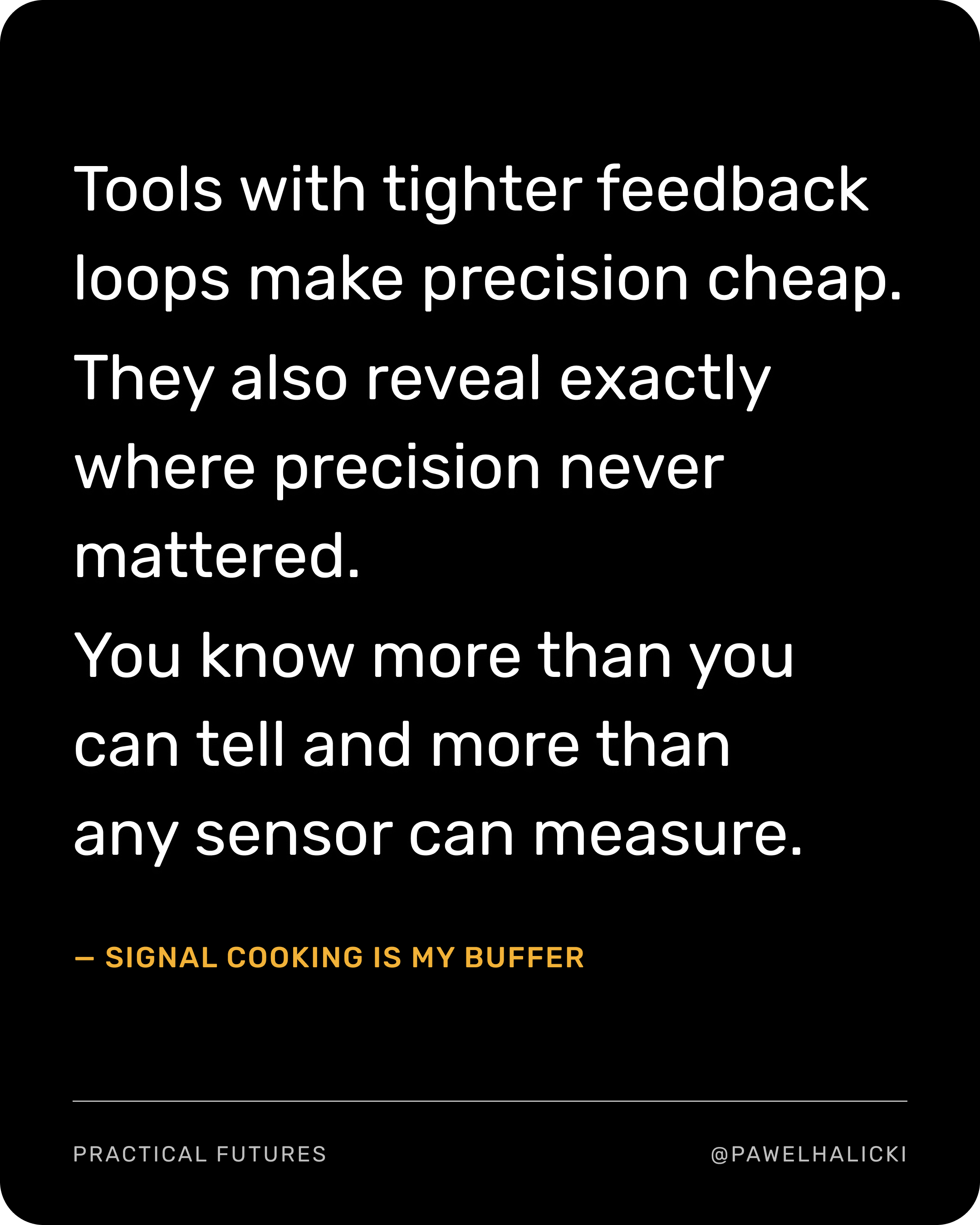 - Mm. Signal cooking. Sensored foods. I set the end state. The kitchen manages the drift.