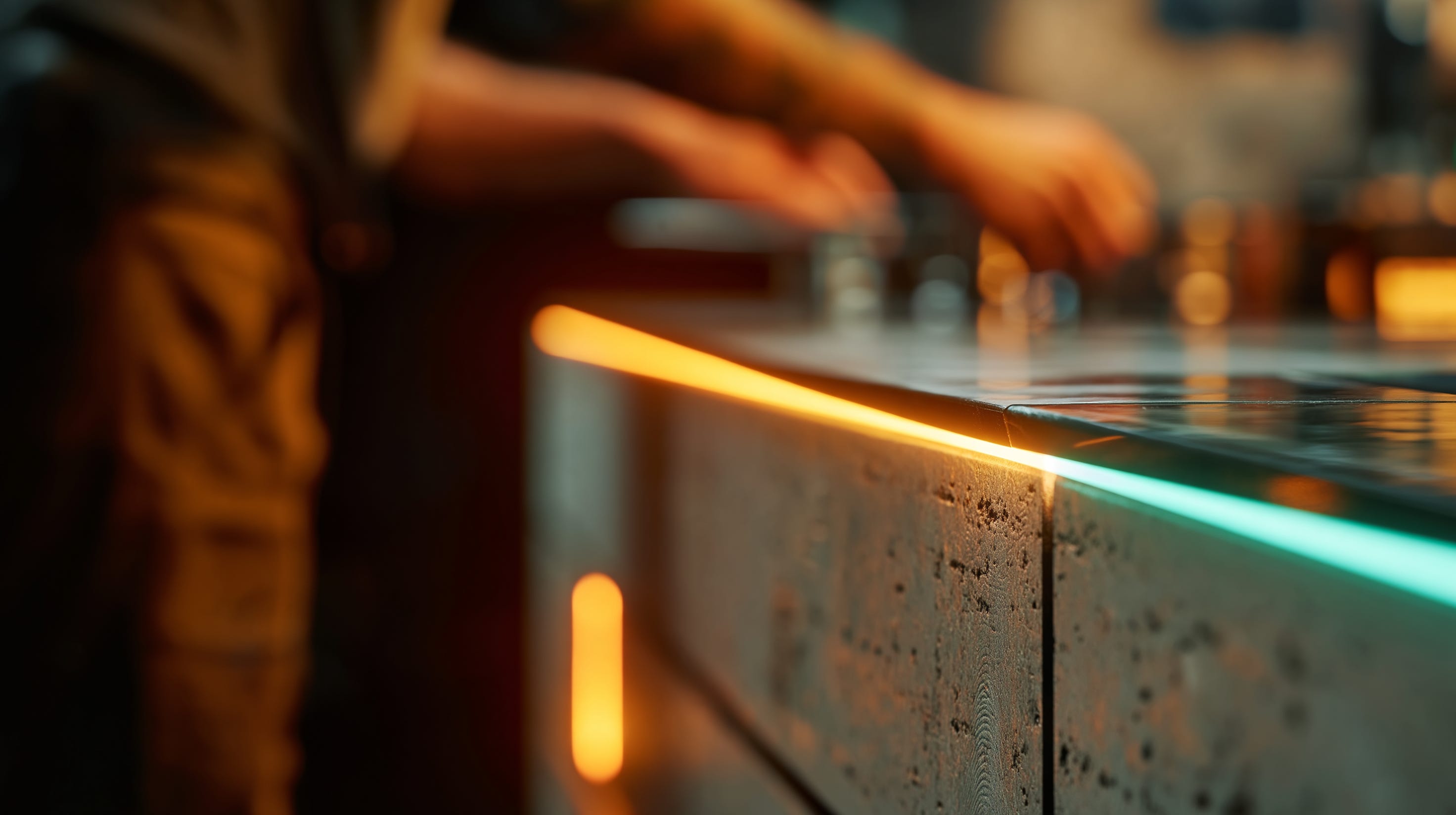A soft pulse runs along the edge of the cabinet in front of the cousin.