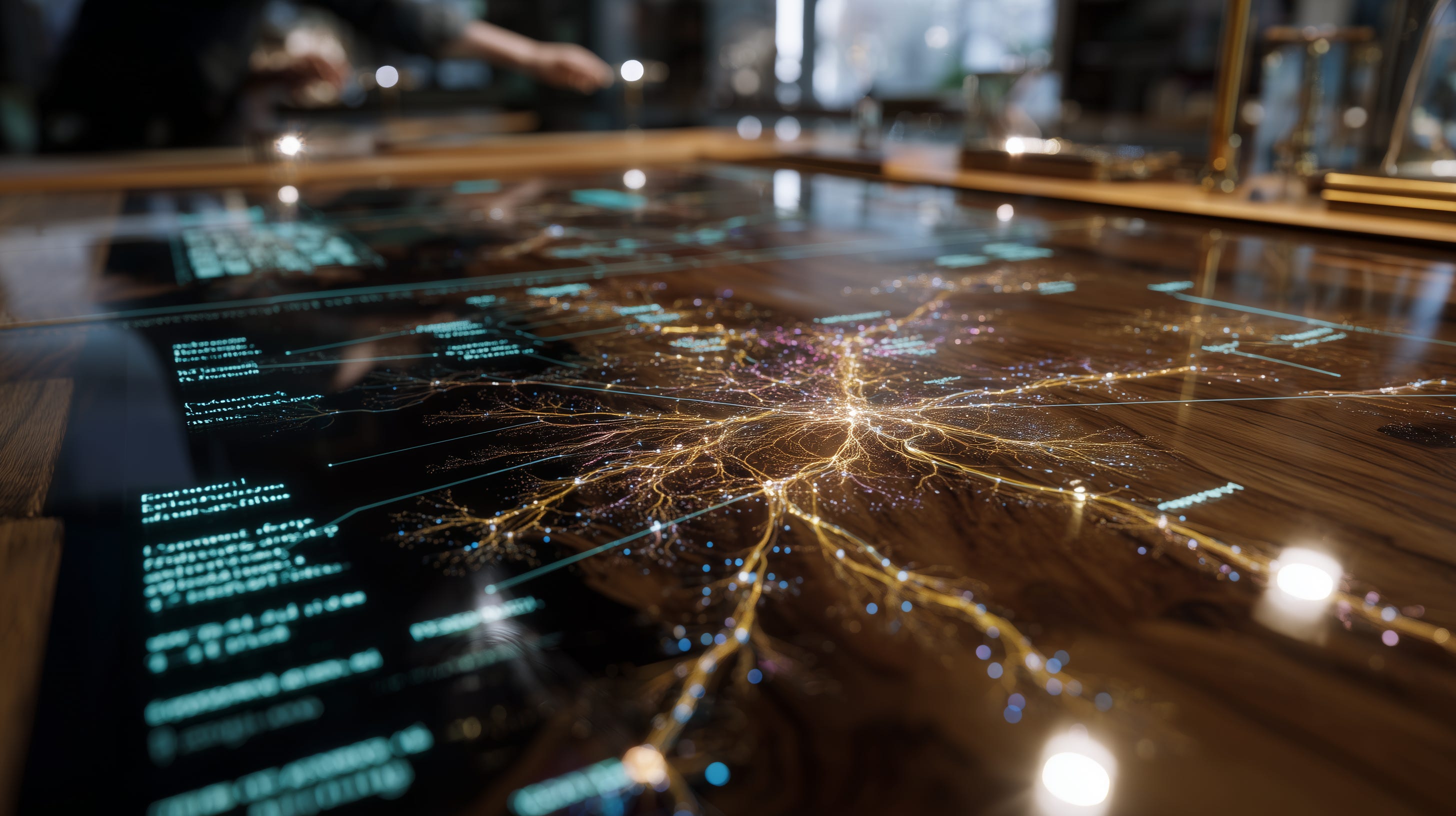 The notary places both palms on the desk. The dark wood surface subtly shifts in colour, and a branching inheritance map appears across the wood, blooming with provenance tags.